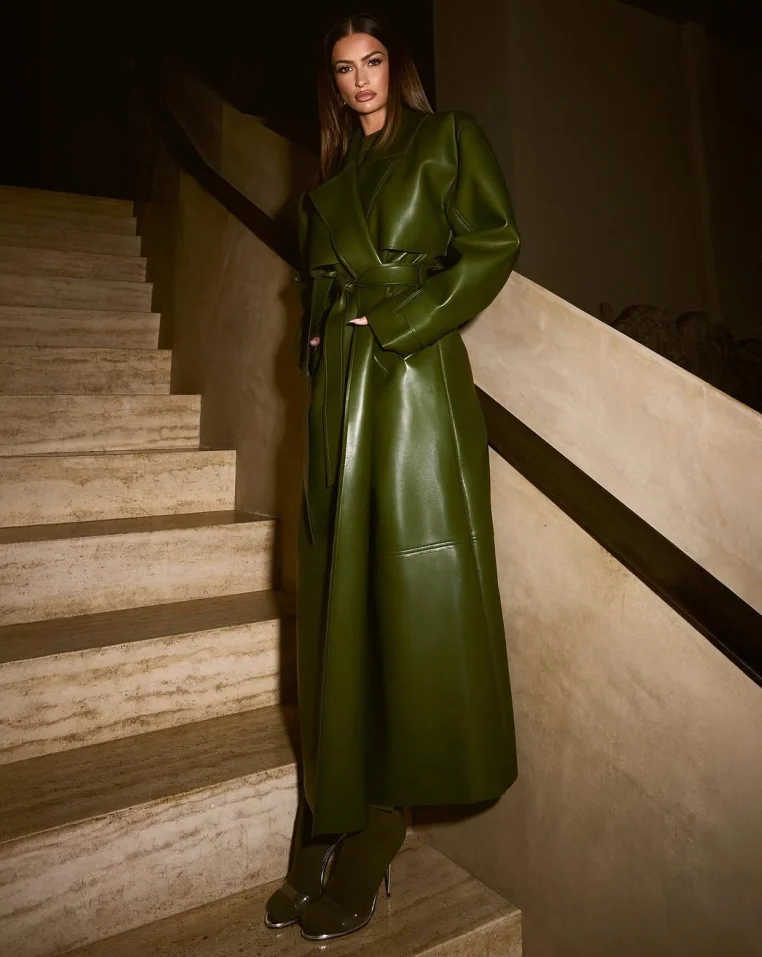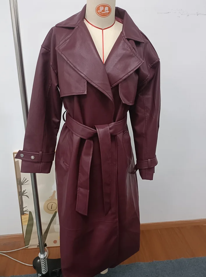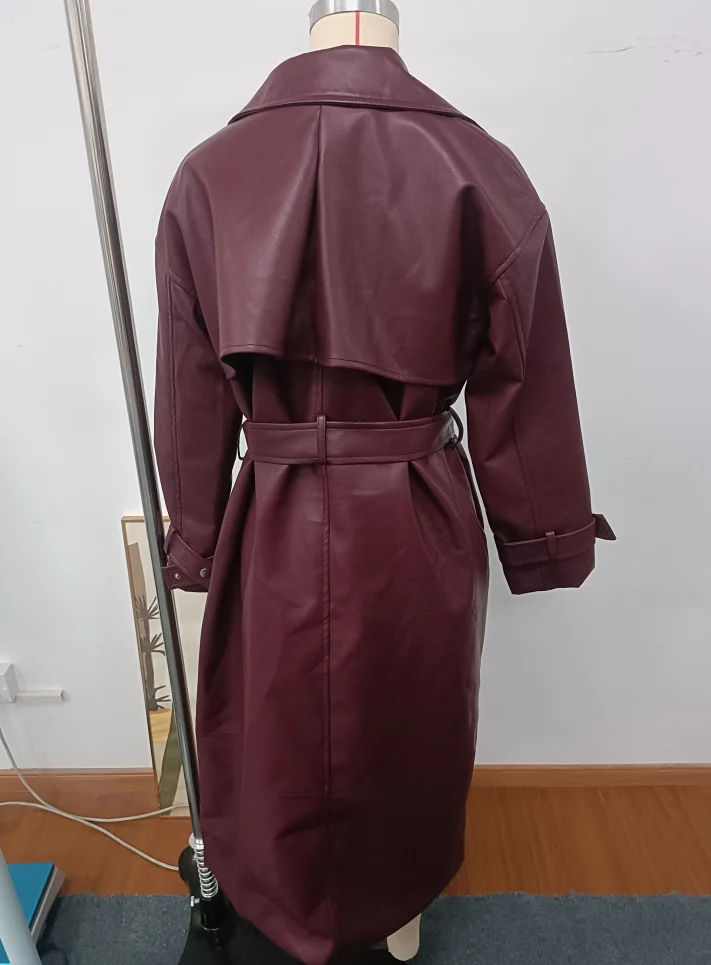 De Bridget Trench Coat in pruim is vervaardigd uit dik imitatieleer en combineert een oversized, full-length silhouet met brede schouders voor een krachtige, moderne look. De ceintuur in de taille en aan de manchetten, de reverskraag met inkeping, stormflap en paspelzakken zorgen voor een verfijnde, tijdloze elegantie.