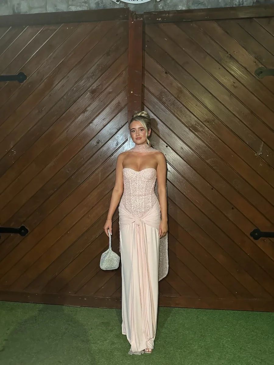 De Carina Maxi Dress in plum brown combineert een versierd mesh lijfje met voorgevormde, beugelcups en een strapless halslijn voor een luxe, sculpted look. De contrasterende slinky jersey rok en de strak geplooide panelen die aan de voorkant worden gestrikt, creëren een slank, verfijnd silhouet met moderne allure.