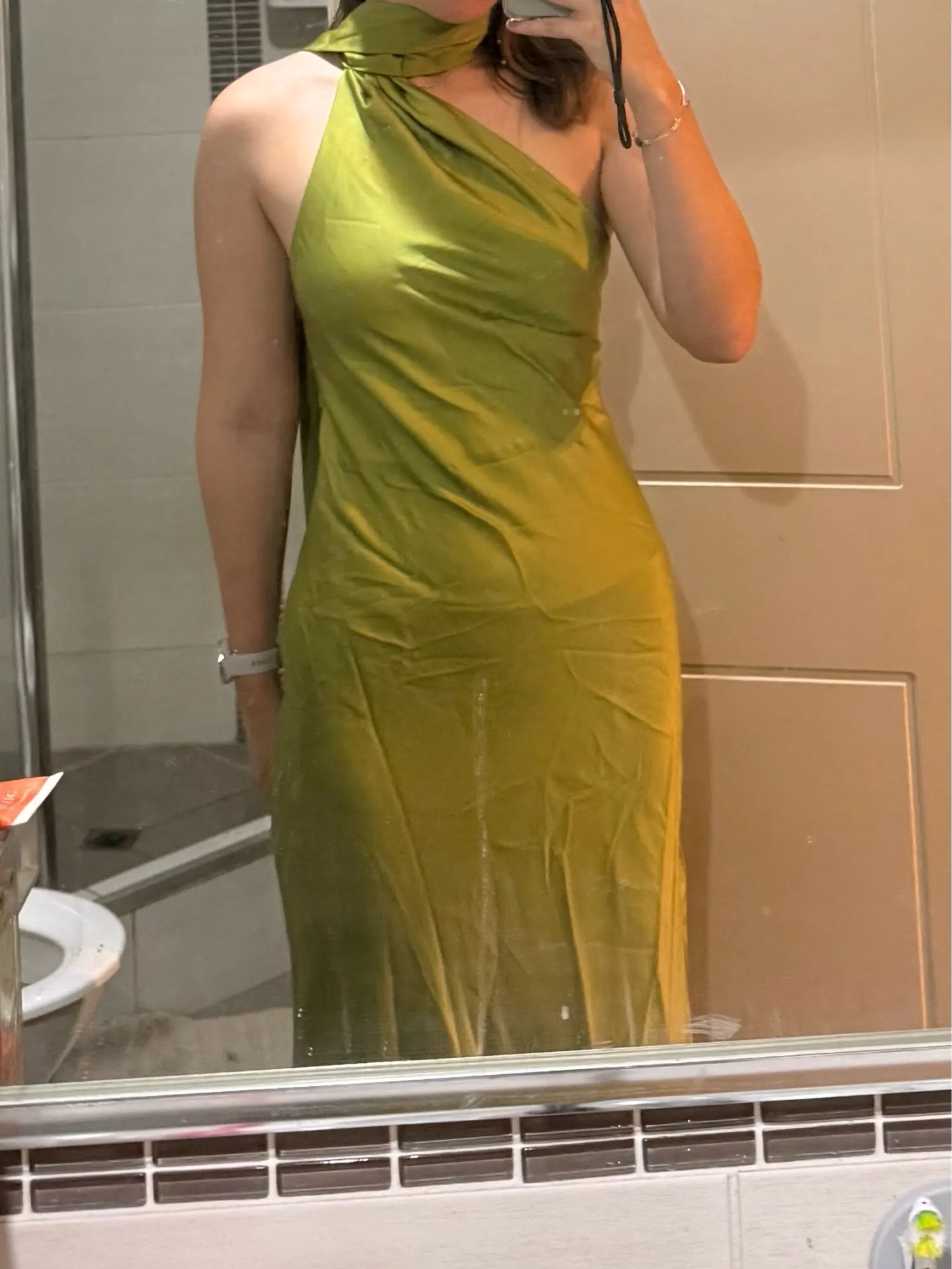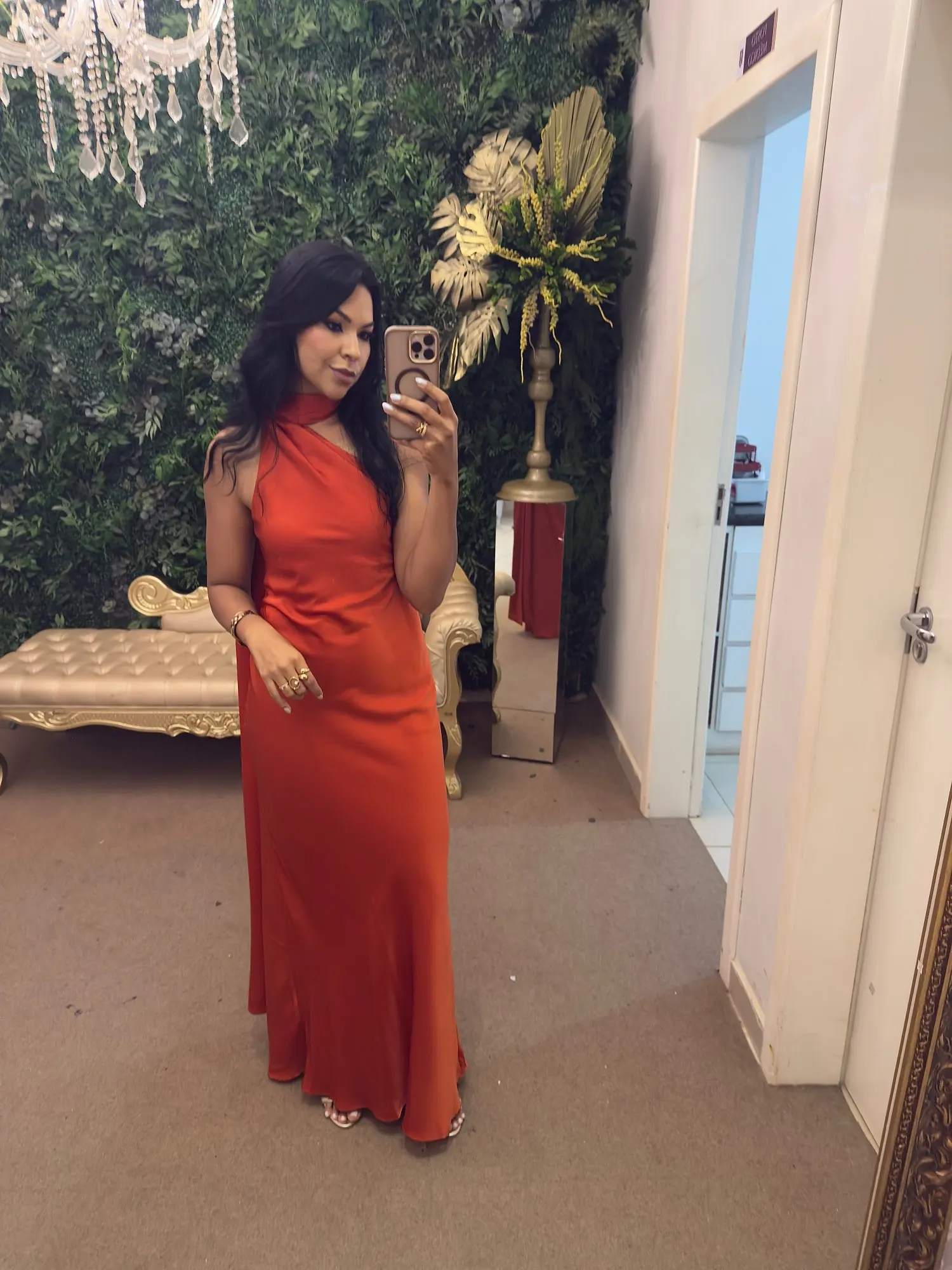 Deze verfijnde avondjurk combineert een sculpturale halslijn met een vloeiende, zijdeachtige stof die moeiteloos om het lichaam valt.
