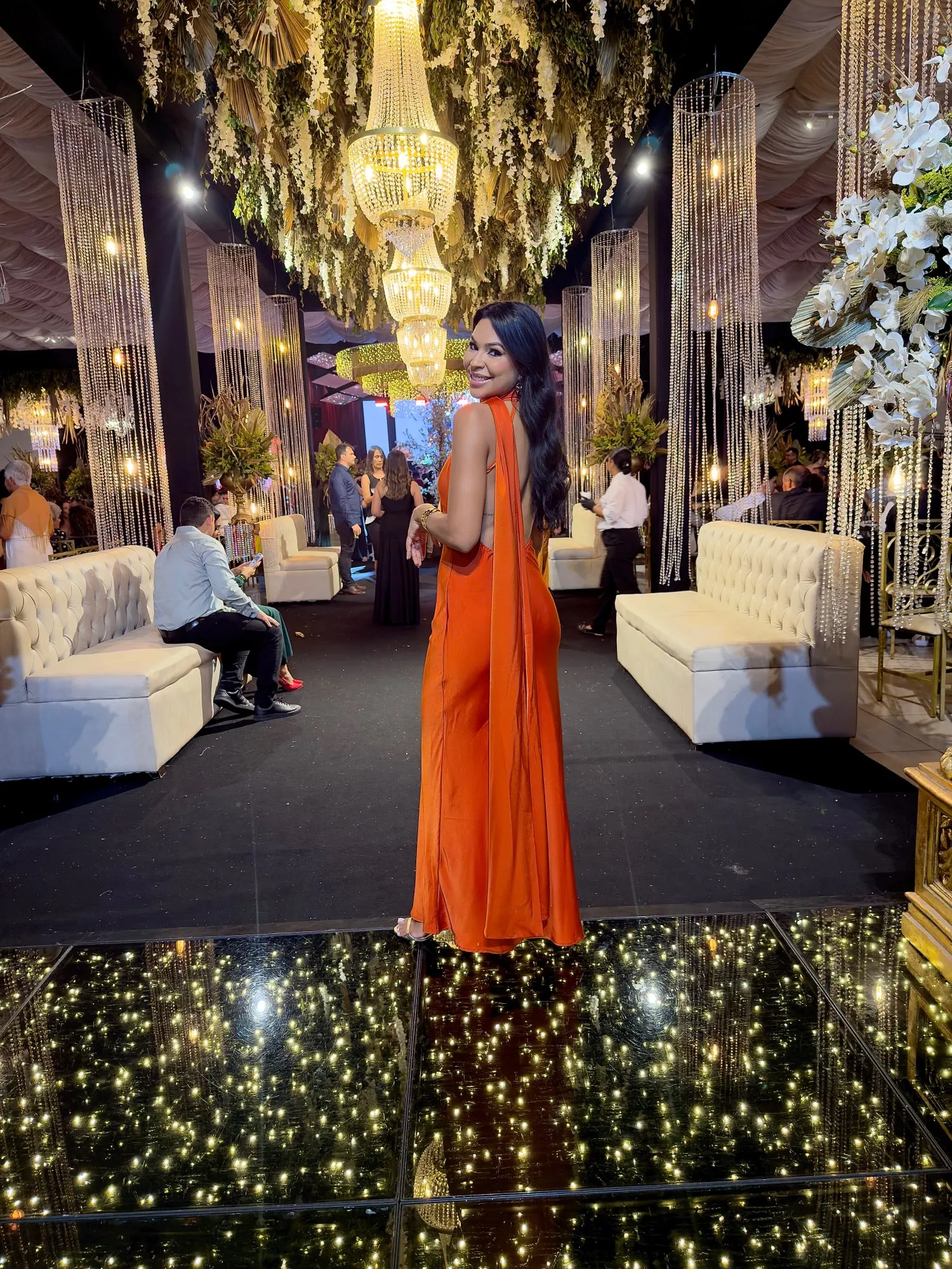 De halterstijl wordt geaccentueerd door een sierlijke, lintachtige drapering die op een indrukwekkende manier mee beweegt bij elke stap een subtiel statement van luxe en vrouwelijkheid.