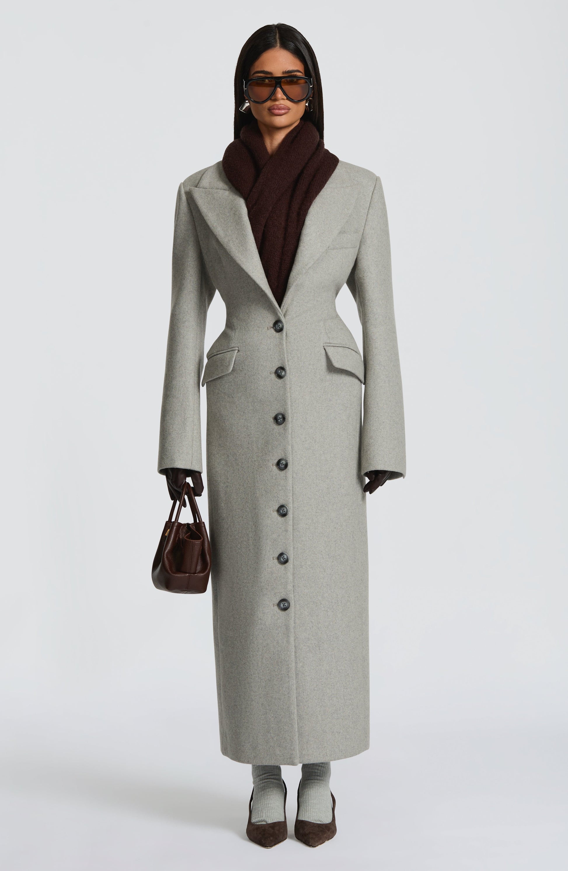 De Ursula Coat in lichtgrijs combineert een verfijnde wolblend met een volledig getailleerd, lang silhouet. De jas is afgewerkt met een reverskraag met brede lapels, een meerknopensluiting en een verstelbare tailleband aan de achterkant voor een elegant aansluitende vorm.