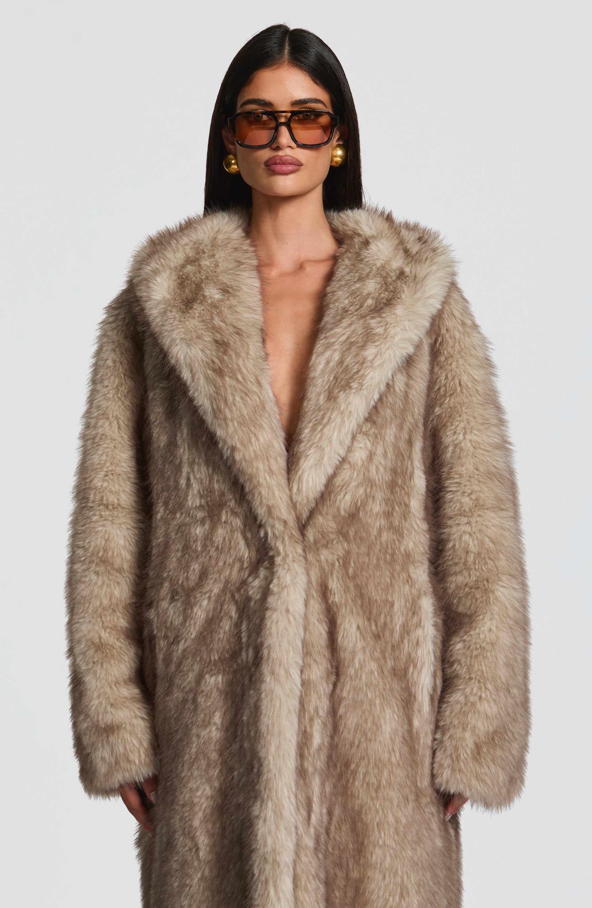 Upgrade je wintergarderobe met de Willow Coat in beige. Deze lange jas is gemaakt van zachte, tweekleurige imitatiebont met een luxueuze, lange pool. Het full-length silhouet, de brede sjaalkraag en de oversized fit combineren warmte met moeiteloze verfijning.